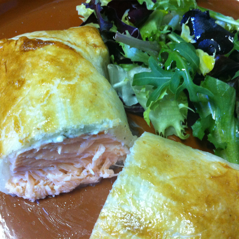Ce délicieux feuilleté est préparé avec une pâte croustillante et légère, enveloppant un savoureux saumon frais .