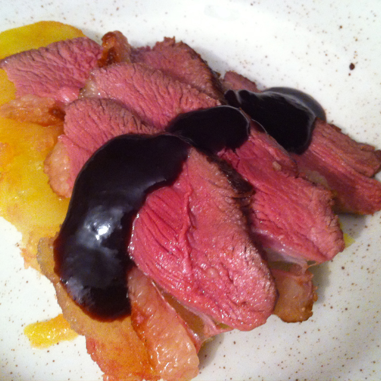 Recouvrez les pommes de terre avec les tranches de magret. Nappez avec la sauce chaude avant de servir.
